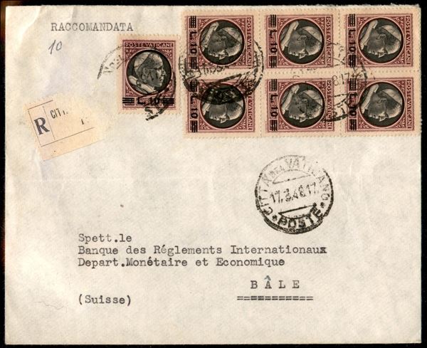 Blocco di 6 + 1 del 10 lire su 5 Medaglioncini (108) su lettera raccomandata per Basilea del 17.3.48