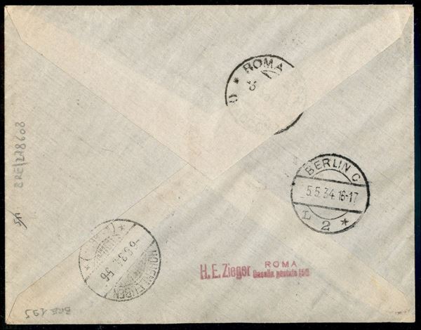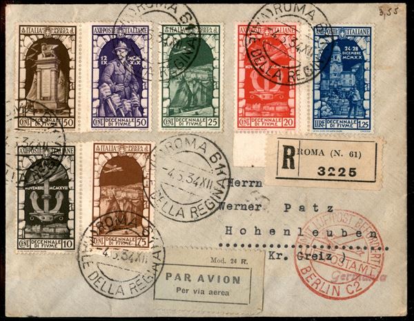 Busta raccomandata Posta Aerea - viaggiata da Roma 4.3.34 affrancata con sette valori Decennale Fiume (350/3 + Aerea 60/2)