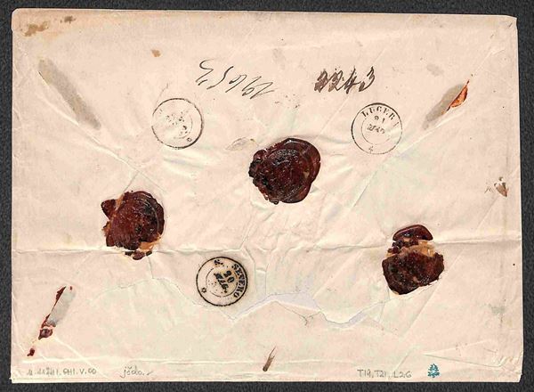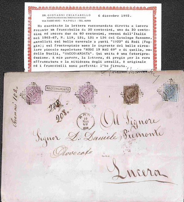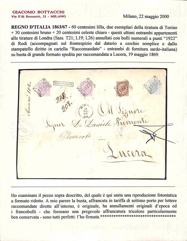Bustone raccomandato con affrancatura tricolore (T21 due + T19 + L26) da Rodi a Lucera del 19.5.69 - molto bella e ben conservata - ex coll. Provera - cert. Chiavarello + cert. Botrtacchi