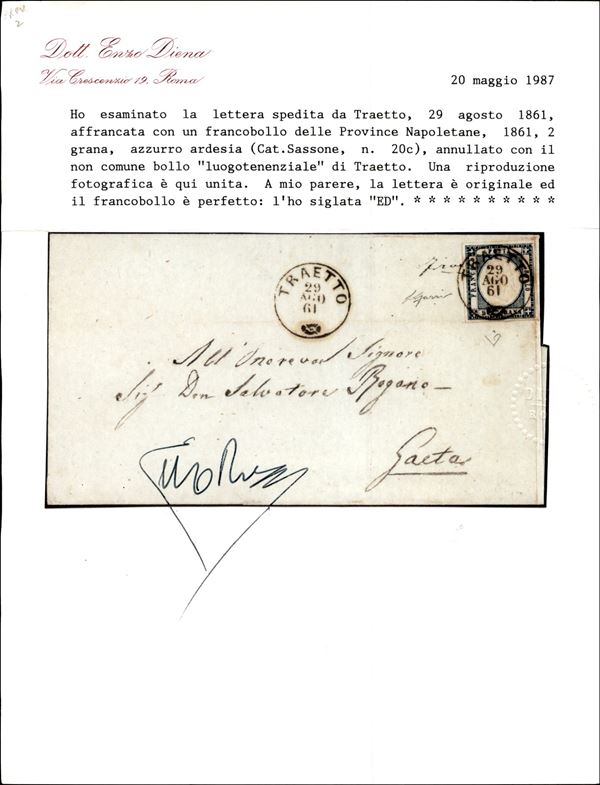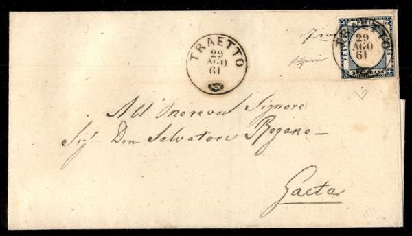 Fresca lettera da Traetto 29.8.61 (P.ti 6) recante 2 grana (20c) ottimamente marginato - ex coll. Provera - LG + cert. ED