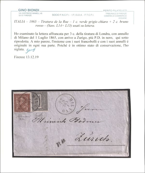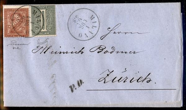 Lettera affrancata con 2 cent (L15) + 1 cent (L14) da Milano per Zurigo del 1 lug. 65 - Vaccari
