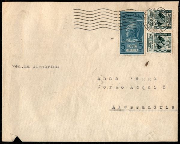 Lettera da Milano 7.11.1952 per Alessandria affrancata con coppia 10 lire verde scuro Forze Armate (699) + 5 lire verde azzurro Posta Pneumatica (19) - bollo d'arrivo al verso del 7 novembre