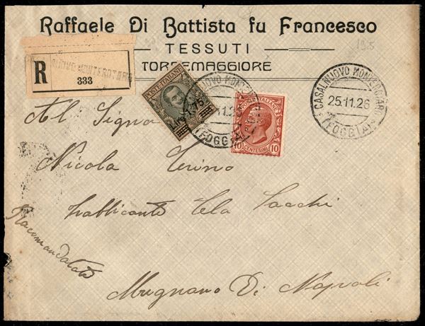 Raccomandata da Castelnuovo Monterotaro (Foggia) 25.11.26 affrancata con 10 cent rosa Leoni + 1,75 lire su 10 oliva e rosa Floreale soprastampato (82 + 182) per Mugnano di Napoli - splendida