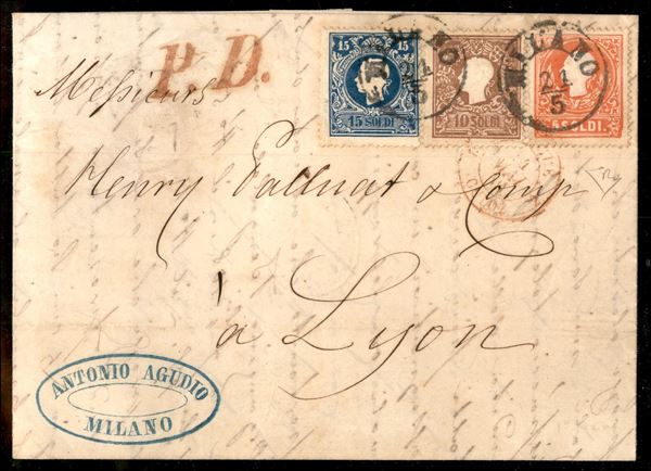 Tricolore - 15 soldi (27) + 10 soldi (26) + 5 soldi (25) - lettera da Milano a Lione del 21.5.1859 - molto bella - cert. En. Diena