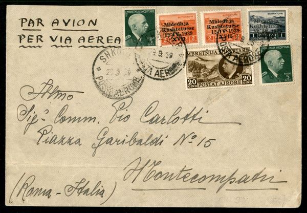 1 qind (1) + due 2 qind (2) + due 5 qind (19) + 20 qind (4 - aerea) - affrancatura multipla di tre emissioni diverse - aerogramma da Shkoder a Roma del 29.9.39 - raro insieme