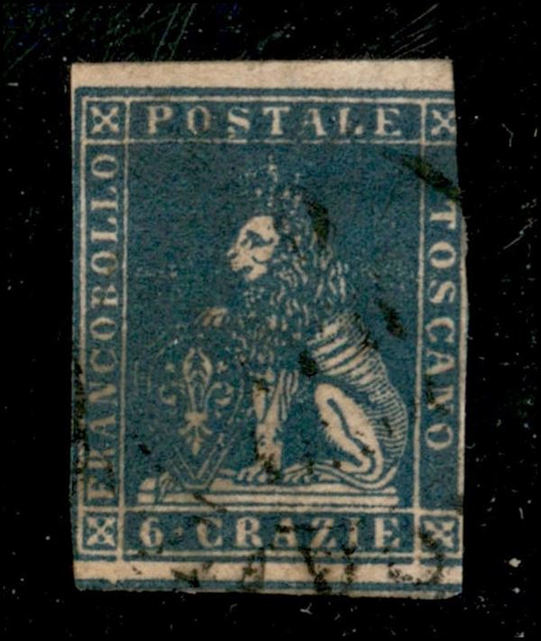 1857 - 6 crazie azzurro cupo (15b) con nitido decalco (da stampa oleosa) - corto in verticale - non catalogato