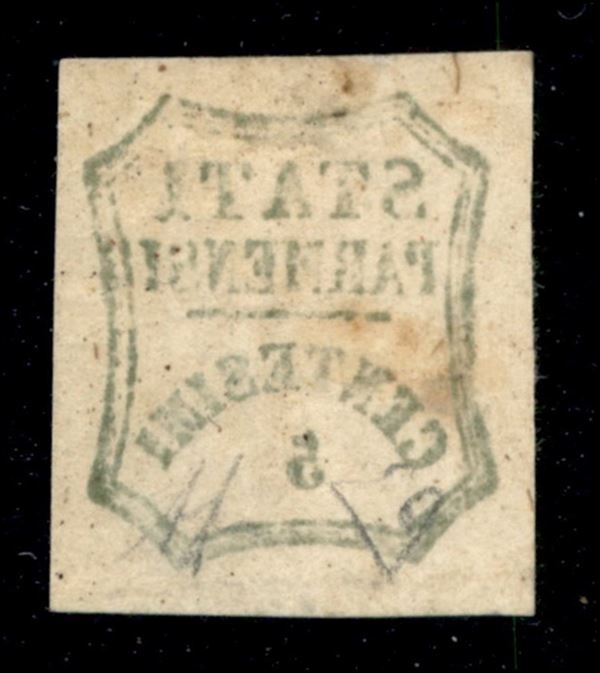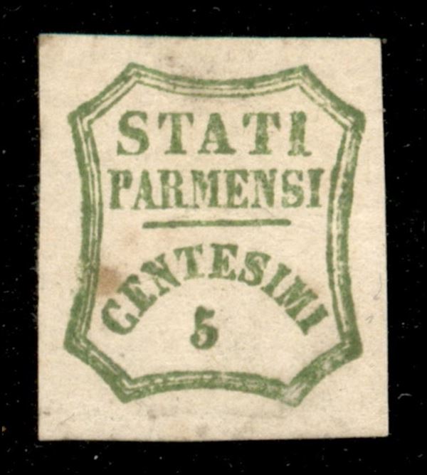 1859 - 5 cent (13 - verde giallo) con decalco oleoso - gomma originale con punti gialli - A. Diena + E Diena