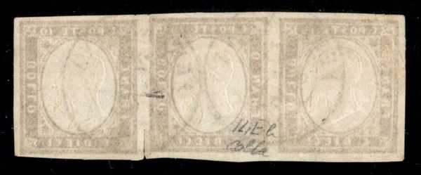 1863 - 10 cent bistro scuro (13Eb) - striscia orizzontale di 3 usata a Ferrandina (P.ti 10) il 29.10.63 - ottimi margini - rara - Colla