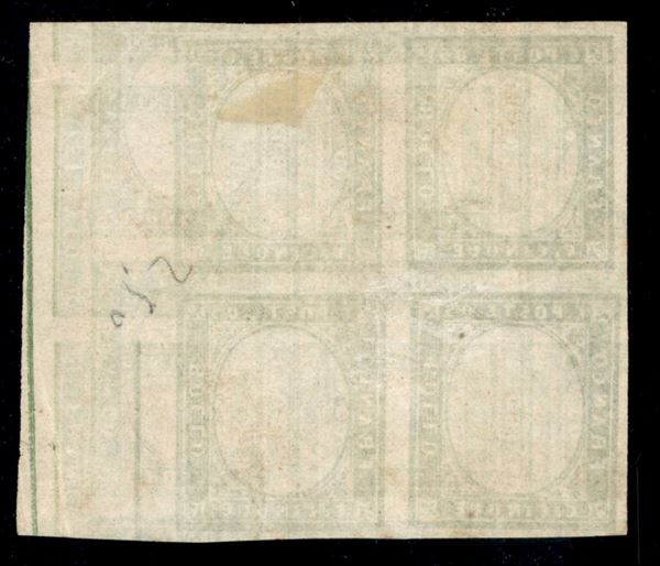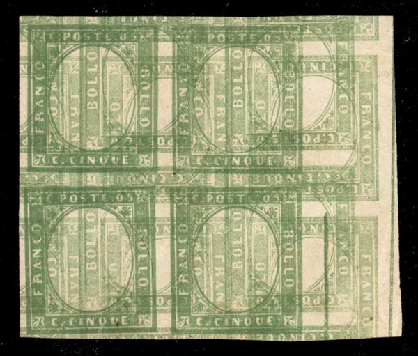 1863 - Resto di Stampa - Senza Effigie - 5 cent (13Ea) - quartina del disegno con grande bordo foglio a destra stampata su una doppia stampa in verticale del 5 cent (13Eb) con linee di riquadro (decalcate al retro) senza gomma