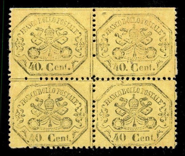 1868 - 40 cent (29 + 29n) in quartina do bordo foglio (in alto) con salto di dentellatura in verticale - gomma integra - Diena + Colla