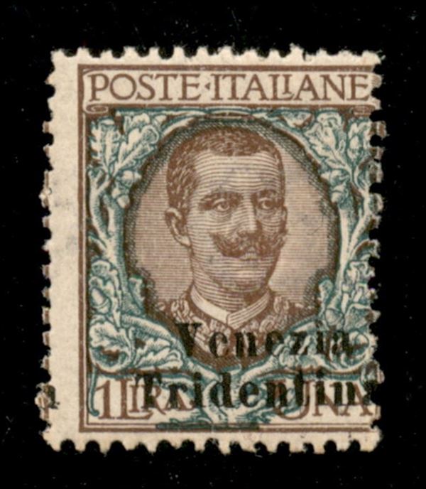 1918 - 1 lira Floreale (27 varietà) con dentellatura verticale spostata e soprastampa a destra (a a cavallo) - gomma originale con leggera traccia di linguella - non catalogato