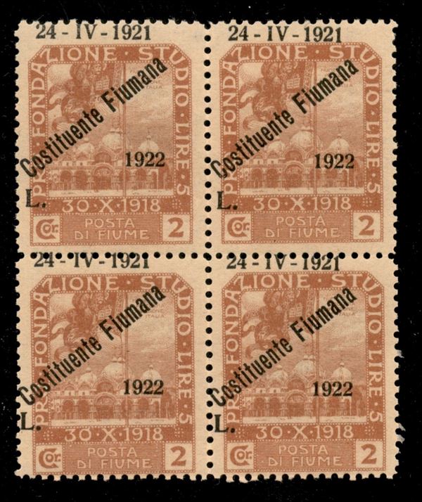 1922 - Quartina del 2 lire su 2 corone Costituente (187 varietà) con soprastampe spostate in alto e a sinistra - gomma integra - non catalogato