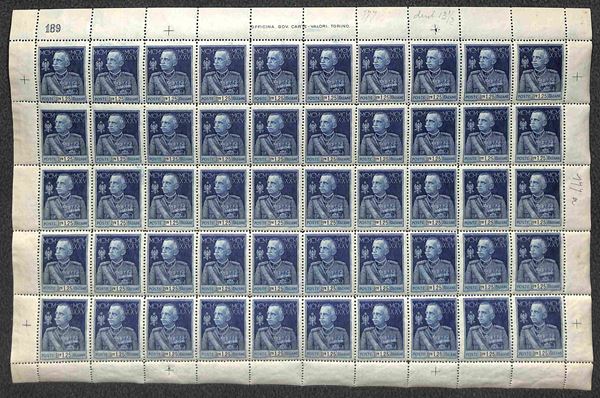 1926 - 1,25 lire Giubileo (188 - varietà) con dentellature orizzontali oblique - intero foglio di 50 con bordi integri e numero di Tavola 189 - gomma integra - non catalogato