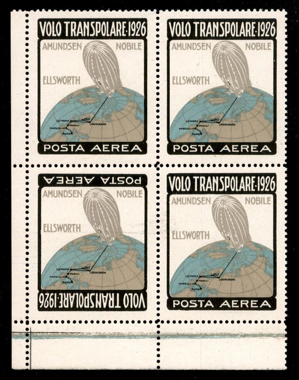 1926 - Etichetta Volo Transpolare - quartina angolo di foglio con esemplare in basso a sinistra con cornice capovolta - gomma integra - molto freschi e belli