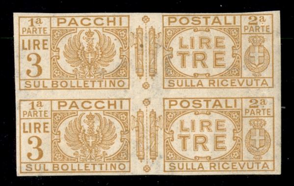 1927 - Coppia del 3 lire (32d) non dentellata - gomma integra - G. Bolaffi