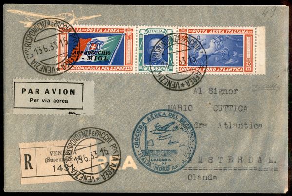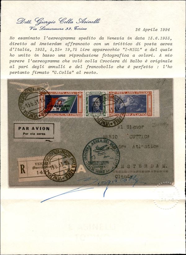 1933 - Crociera Aerea del Decennale - Volo Roma Amsterdam - Longhi 2853 - aerogramma affrancato con Trittico I-MIGL (51K) - cert. Colla