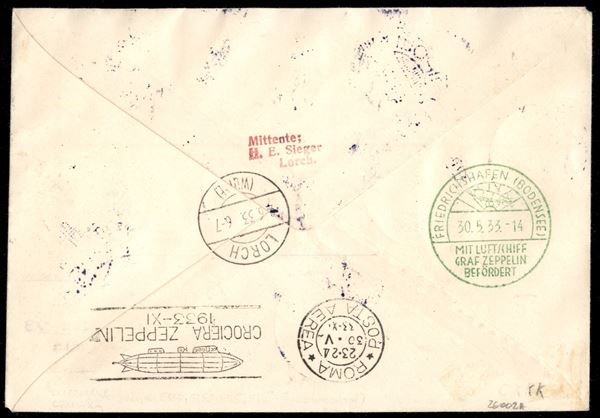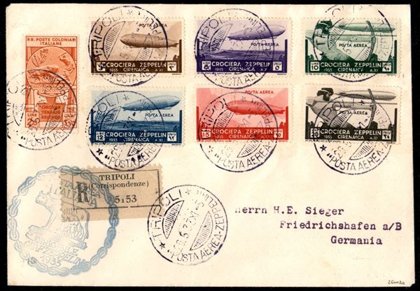 1933 - Zeppelin - busta affrancata con serie completa Crociera Zeppelin (12/17) + 2,75 lire Centenario Eritreo (29 - Em. Generali) da Tripoli per Friedrichshafen del 29.5.33