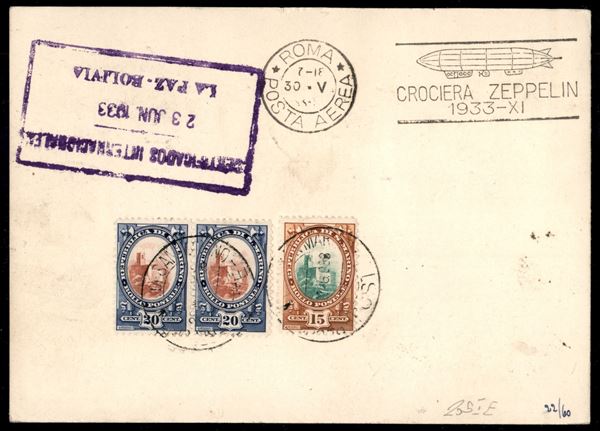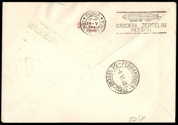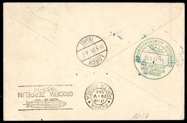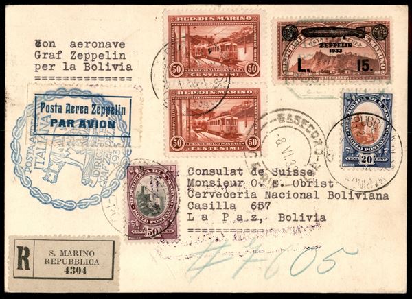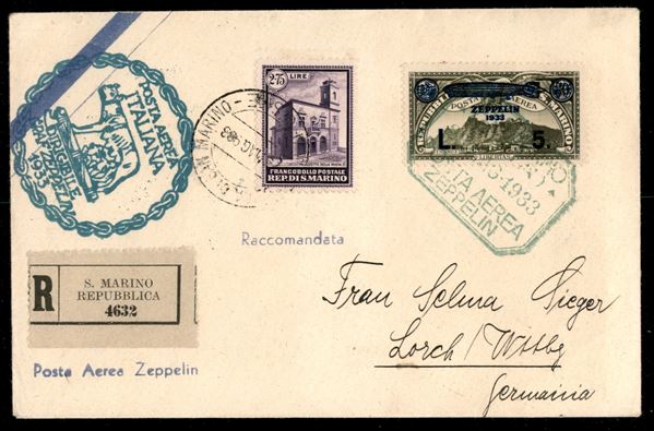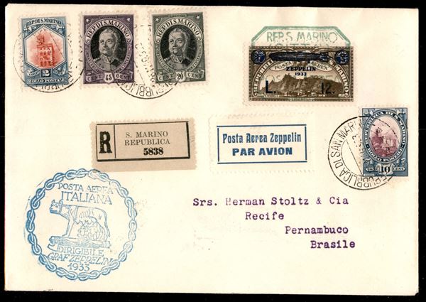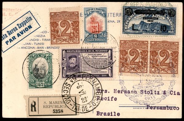 1933 - Zeppelin - Insieme di 6 buste con i sei valori della serie Zeppelin (11/16) + complementari - da San Marino per Buenos Aires Pernambuco La Paz e Lorch - tutte con bolli d'arrivo
