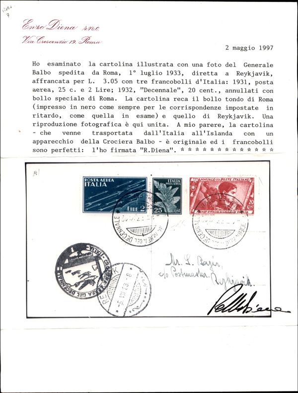 1933 (1 luglio/12 agosto) - Crociera Aerea del Decennale - Corriere Supplementare - Longhi 2919 - cartolina per Reykjavik - cert. Enzo Diena