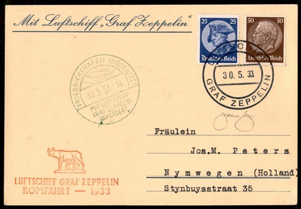 1933 (30 maggio) - Zeppelin Romfahrt - Longhi 243 - cartolina dalla Germania per l'Olanda con bollo verde figurato