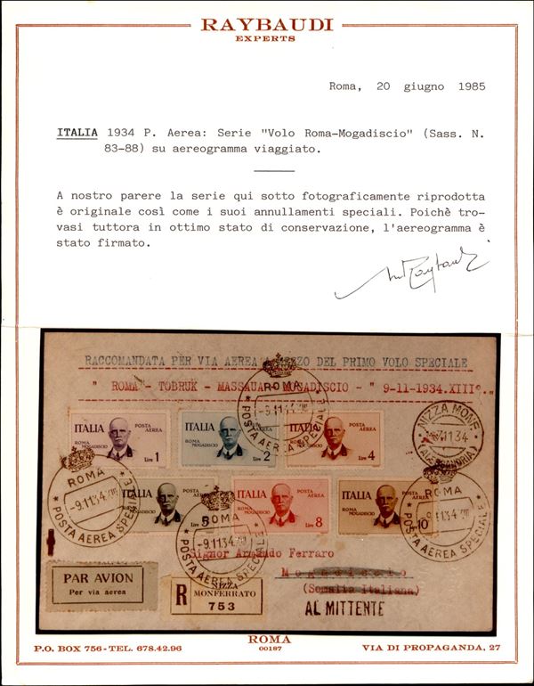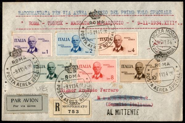 1934 (10/11 novembre) - Primo Volo Roma Mogadiscio - busta raccomandata con la serie completa (Aerea 83/88) - Longhi 3197 - cert. Raybaudi