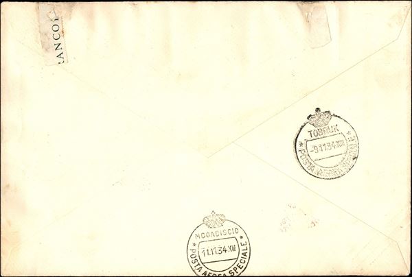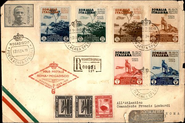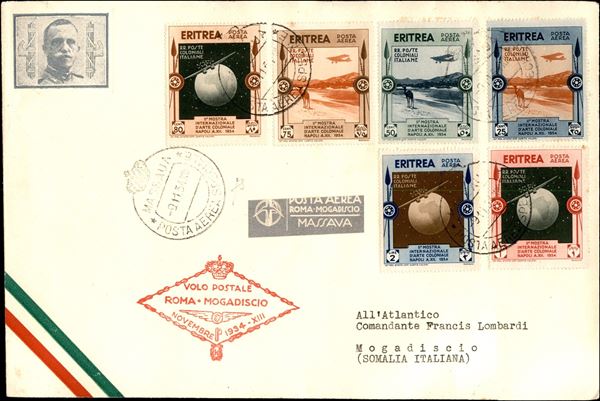 1934 (novembre) - Primo Volo Roma Mogadiscio - insieme di quattro aerogrammi diversi con serie completa Posta Aerea Mostra Coloniale delle emissioni Cirenaica Eritrea Somalia e Tripolitania - bell'insieme