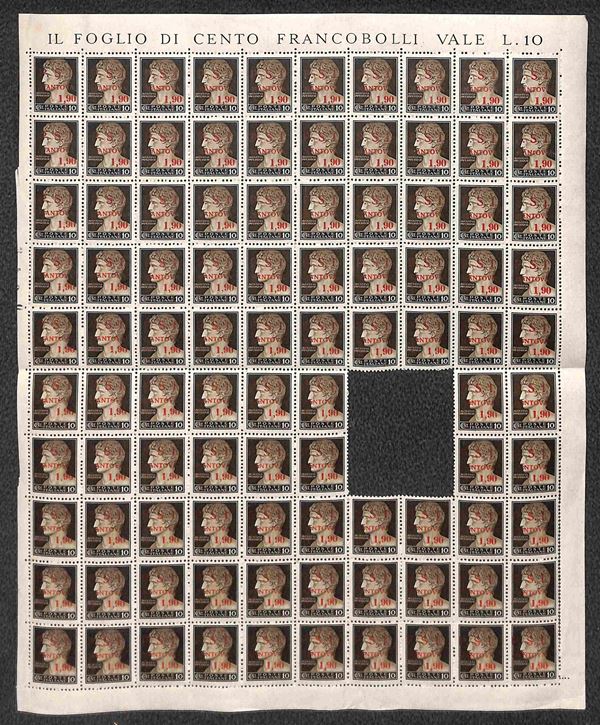 1945 - 10 cent + 1,90 lire (1) - blocco di 96 in foglio con bordi integri (manca quartina 57/68) con tutti gli errori della composizione (anche non catalogati) - gomma integra