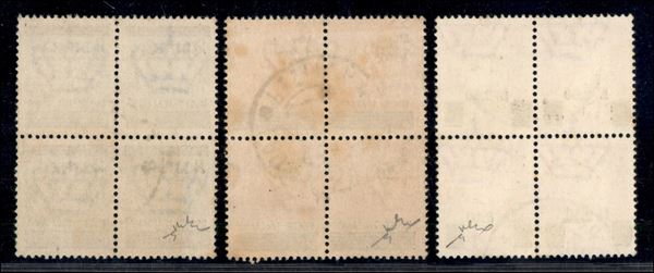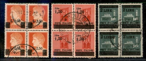 1945 - Soprastampati (523/525) - insieme di tre valori in quartine usate - Chiavarello