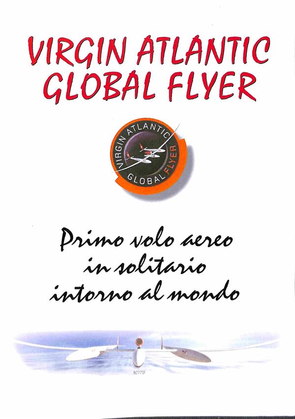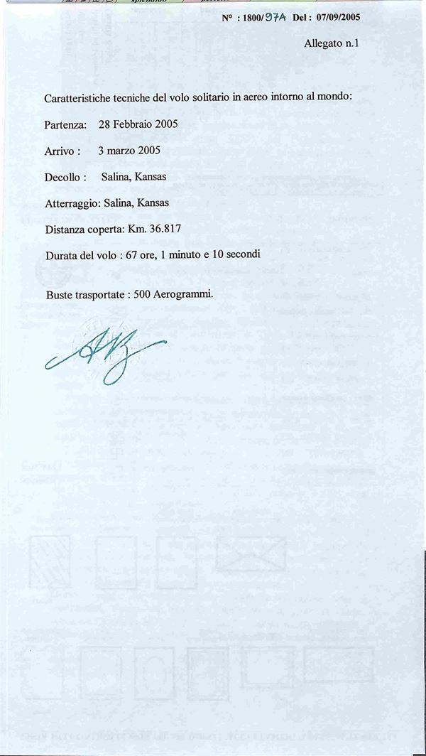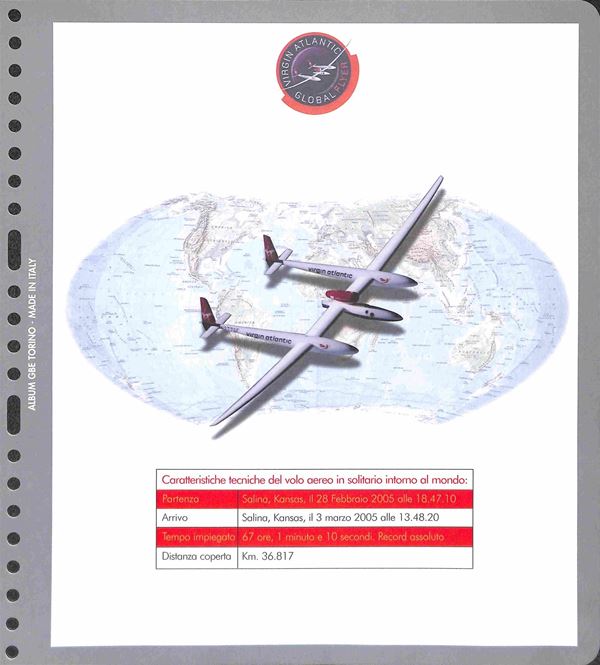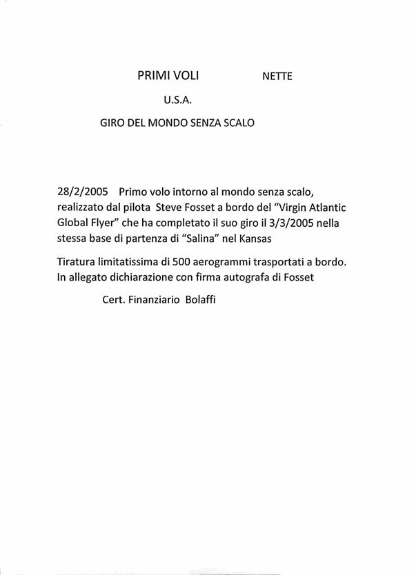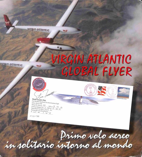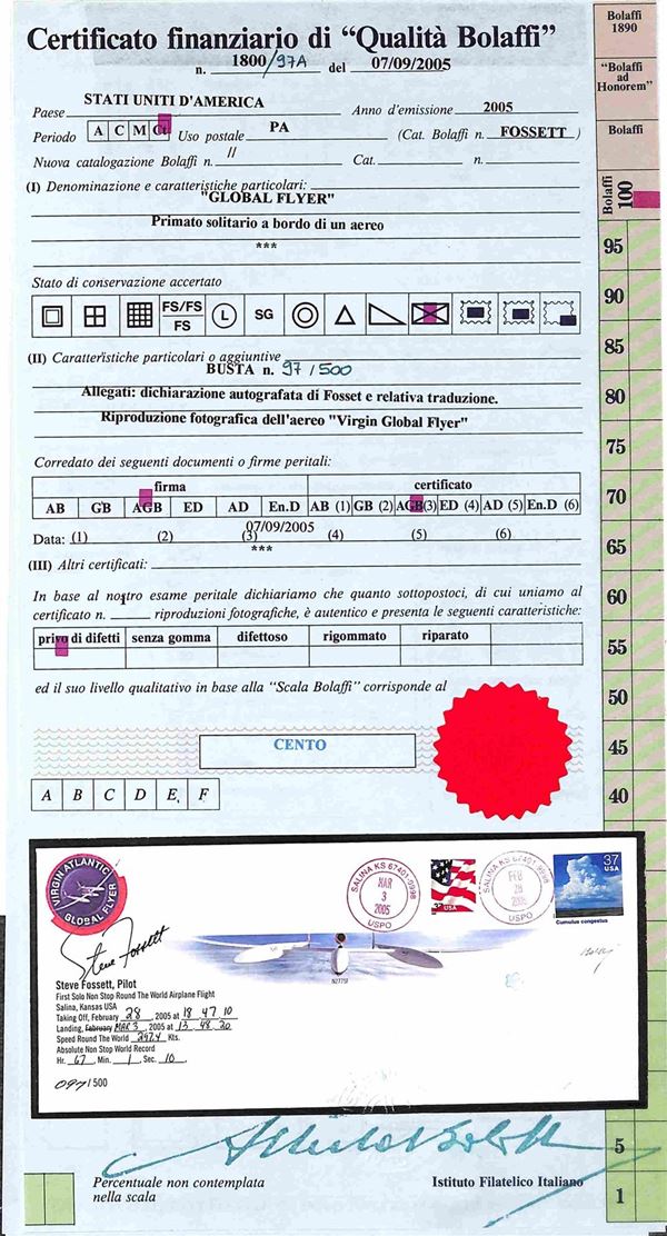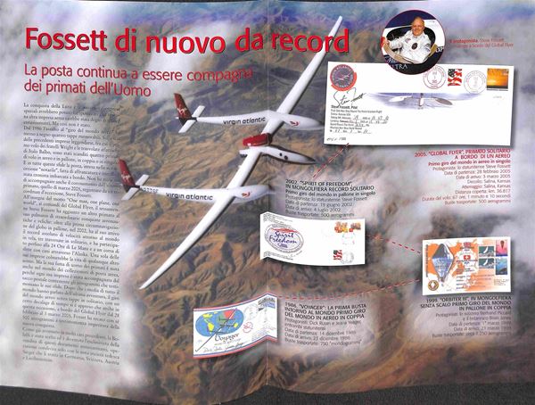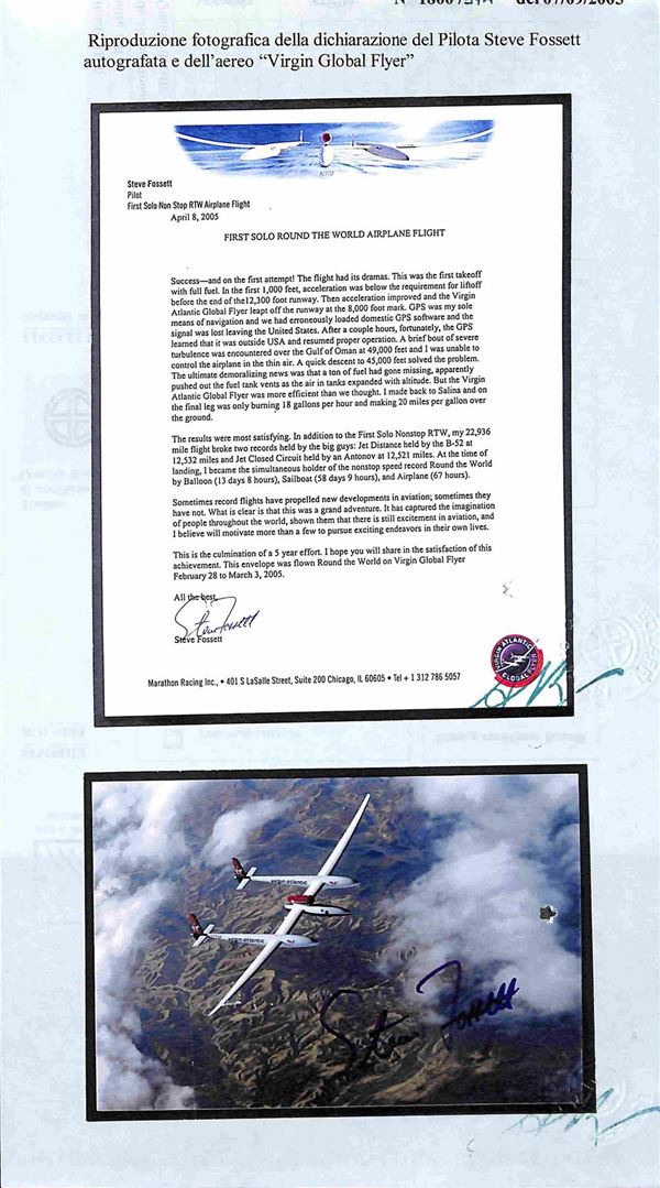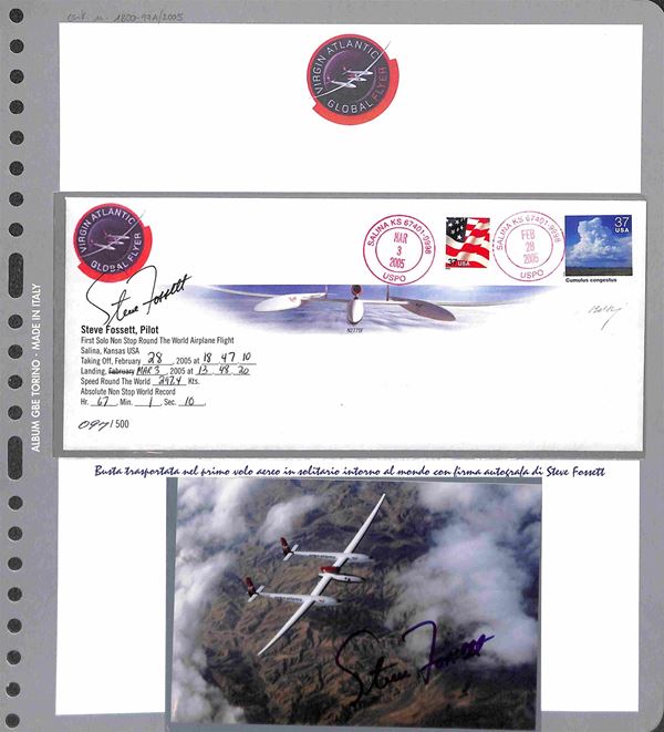 2005 - 28 (febbraio) - Primo volo aereo in solitario intorno al mondo senza scalo del pilota Steve Fossett - folder con all'interno la busta N. 097 su 500 trasportate dal velivolo contenente dichiarazione autografata dal pilota + foto autografa - cert. Bolaffi 100