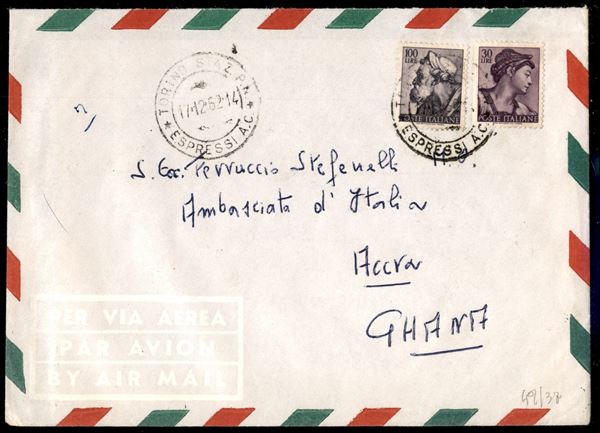 Aerogramma affrancato con 30 + 100 lire Michelangiolesca (905 + 912) da Torino per Accra (Ghana) del 17.12.62