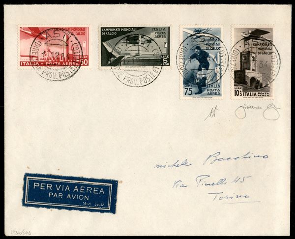 Aerogramma affrancato con Calcio Posta Aerea serie completa (69/72) da Asti a Torino del 17.12.34 - AD + Longhii