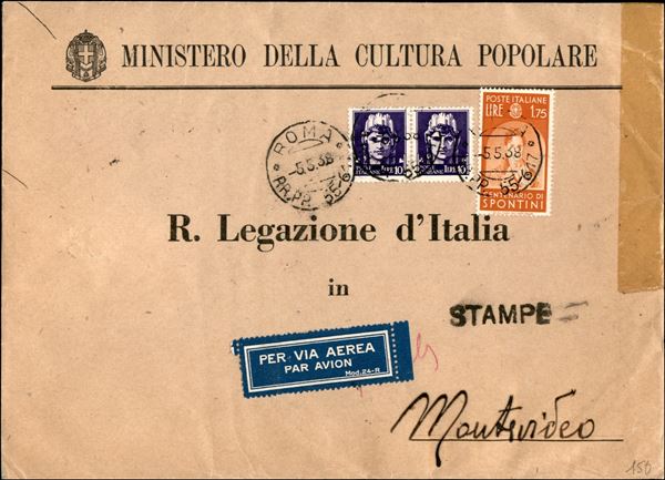 Aerogramma affrancato con coppia orizzontale del 10 lire Imperiale (258) + 1,75 lire Spontini (433) dal Ministero della Cultura Popolare per Montevideo del 5.5.38 - ex coll. Provera
