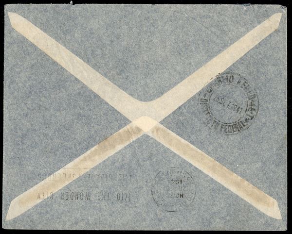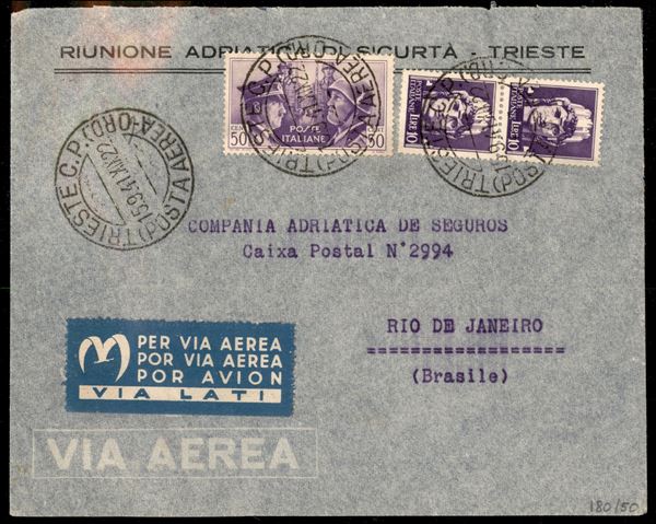 Aerogramma affrancato con coppia verticale del 10 lire Imperiale (258) + 50 cent Fratellanza (455) da Trieste per Rio de Janeiro del 15.9.41