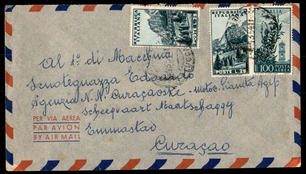 Aerogramma affrancato con due 25 lire Turistica (730) + 100 lire Campidoglio Aerea (142) da Viareggio per Curacao del 5.3.54 - rara destinazione