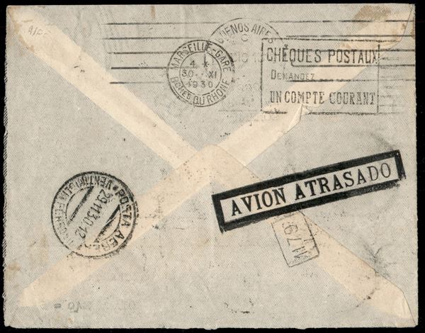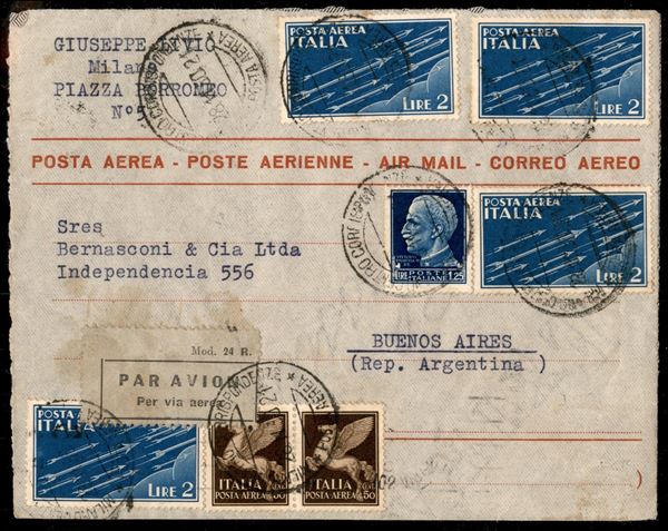 Aerogramma affrancato con quattro 2 lire Imperiale Aerea (15) + coppia orizzontale 50 cent Imperiale Aerea (11) + 1,25 lire Imperiale (253) - da Milano per Buenos Aires via Ventimiglia e Marsiglia de 28.11.30