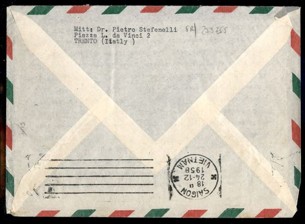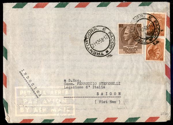 Aerogramma affrancato con Turrita 100 lire + coppia del 80 lire (718 due + 747) da Trento per Saigon (Vietnam) del 21.12.58 - completo di testo