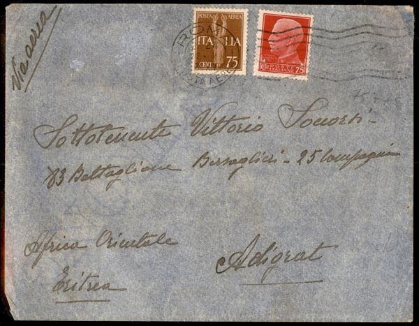 Aerogramma affrancato con valori gemelli 75 cent Imperiale Aerea (12) + complementare 75 cent Imperiale (252) da Roma per Adigrat del 22.2.36 - ex coll. Provera