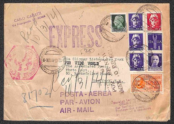 Aerogramma espresso affrancato con 25 + 50 cent + 1 + 2 + tre 10 lire Imperiale (248 + 251 + 252A + 255 + tre 258) + 2,50 lire Espresso (16) dal Ministero della Cultura Popolare per New York del 10.10.41