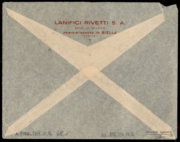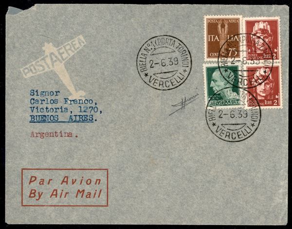 Aerogramma per Buenos Aires affrancato con Imperiale 20 lire verde giallo + coppia 2 lire carminio + Miti e Simboli 75 cent bruno giallo (255 + 259 + Aerea 12) da Biella N. 1 (Porta Torino) 2.6.39 - Sorani - ex coll. Provera
