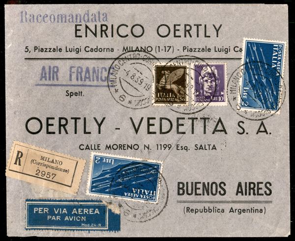 Aerogramma raccomandato affrancato con due 2 lire Imperiale Aerea (15) + 50 cent Imperiale Aerea (11) + 10 lire Imperiale (258) da Milano per Buenos Aires del 4.8.39
