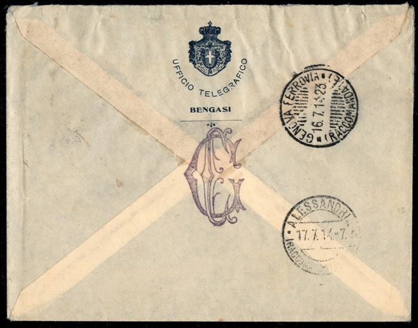 Bengasi (Assicurata) 13.7.14 (non catalogato) - 40 cent (8) su busta raccomandata per Alessandria