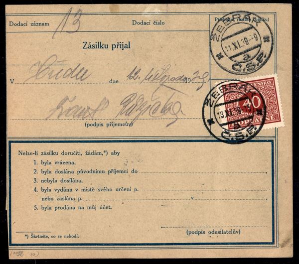 Boemia/Moravia - Occ. Tedesca - Bollettino Pacchi da Praga a Zebrak del 10.11.39