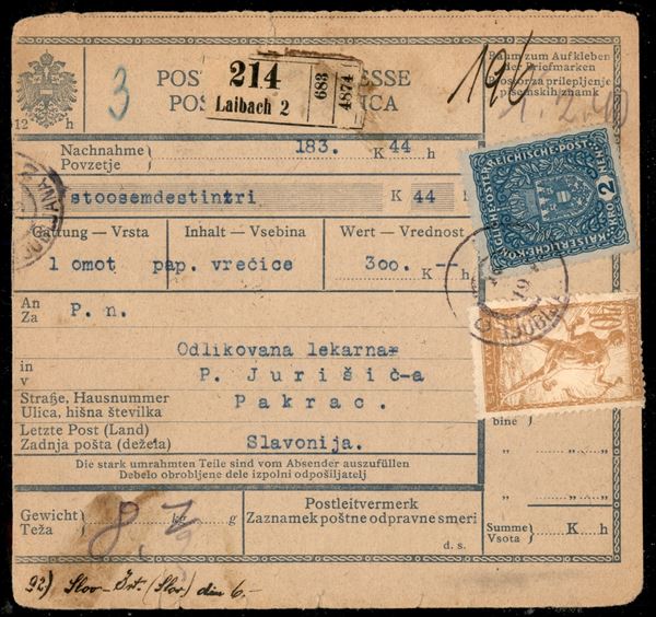 Bollettino di Spedizione per Pakrac del 18.4.19 con affrancatura mista Austria/Jugoslavia