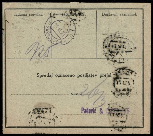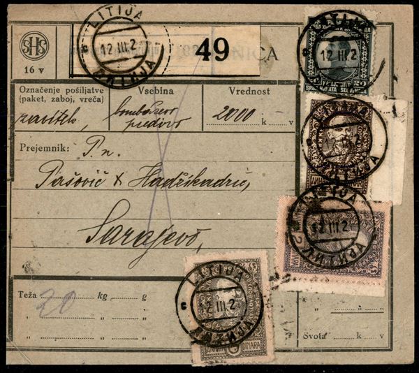 Bollettino Pacchi da Litija a Sarajevo del 12.3.21 con affrancatura multipla (129 + 130 + 132 + 149)