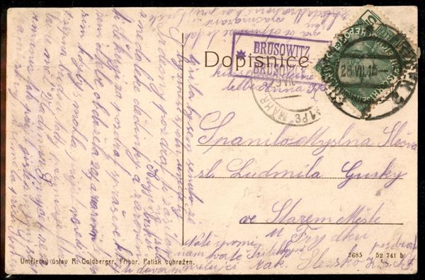 Brusowitz (viola) - cartolina per Starem Meste del 28.7.1915 - piega d'angolo a sinistra