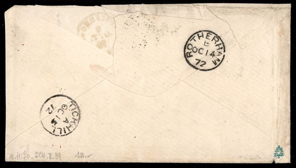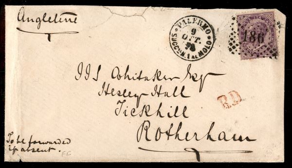 Busta affrancata con 60 cent V. Emanuele II lilla intenso violaceo (T21b) da Palermo a Rotherham (Inghilterra) del 9. ott. 78 - ex coll. Provera