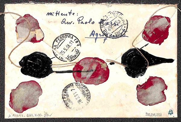 Busta assicurata affrancata con Imperiale un 10 cent (245) + due 30 cent (249) + tre 1,75 lire (254) con sigilli intatti (con appunto scritto sul fronte) da Agrigento per Ascoli Piceno via Roma del 27.5.38 - ex coll. Provera