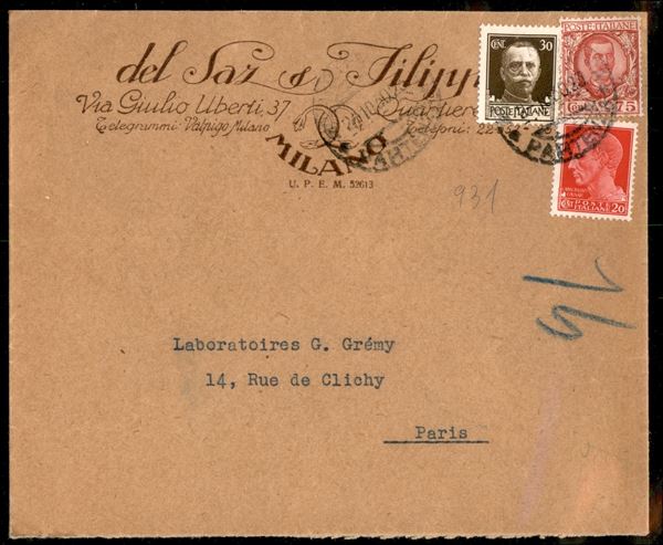 Busta con affrancatura tricolore mista Imperiale 20 + 30 cent (247/249) + 75 cent Floreale (201) da Milano a Parigi del 24.10.30 - ex coll. Provera