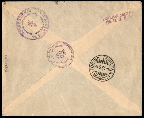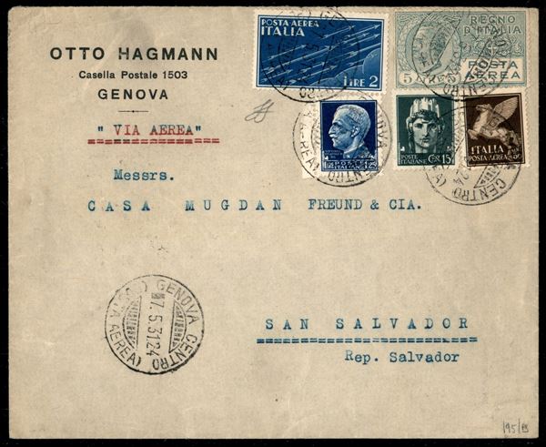 Busta da Genova 7.5.31 viaggiata per San Salvador con affrancatura multipla fra cui 5 lire aereo (Aerea 7 + 11 + 15 + Imperiale 246 + 253)
