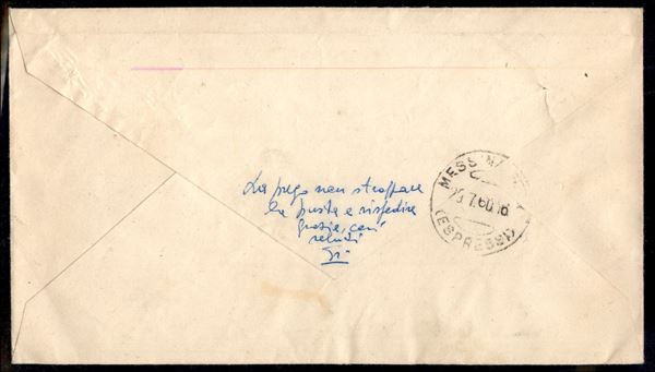 Busta espresso affrancata con tre 25 lire + 601 lire Spedizione dei Mille (882 + 884) da Roma "Villaggio Olimpico" per Messina del 28.7.60